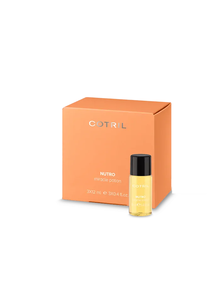 Ultra vyživujicí ampule Cotril Nutro (Miracle Potion) je silně koncentrovaný elixír pro okamžitou výživu matných, suchých a vyprahlých vlasů. Elixír dodává vlasům potřebnou výživu, zanechává je krásně jemné a hebké, a navíc krásně voní. Jedinečný mix 12 vzácných olejů z ořechů, semínek, bylinek a ovoce garantuje mimořádné vyživující působení. Tyto aktivní složky pomáhají vyživit jednotlivé vrstvy vlasového vlákna a zároveň obnovují přirozený hydrolipidický plášť pro lesklejší, zářivější a vitálnější vlasy bez krepatění. Elixír okamžitě vyživí suché vlasy, dodá jim dávku hydratace, a díky tomu se budou krásně lesknout a zářit zdravím. Již po první aplikaci jsou vlasy viditelně vyživené a se zdravějším vzhledem.