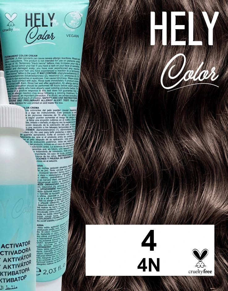 Profesionální permanentní krémová barva na vlasy Hely Color je určena pro domácí použití. Vegan složení obohaceno o organický smil italský (Helichrysum italicum) a technologii plex zaručuje maximální krytí šedin, dlouhotrvající výsledek, lesklé a vyživené vlasy. Hely Color dokonale překryje šediny a obsahuje speciální pečující složky (smil italský), takže vlasy budou doslova zářit zdravím. Certifikát PETA Cruelty Free zaručuje, že produkt ani v něm použité suroviny nebyly testované na zvířatech. Speciální krémová textura napomáhá snadné a bezpečné aplikaci. Barva garantuje absolutní krytí šedivých vlasů, dlouhodobou stabilitu barvy, perfektní jednotné výsledky a neuvěřitelný lesk. Vyrobeno v Itálii.