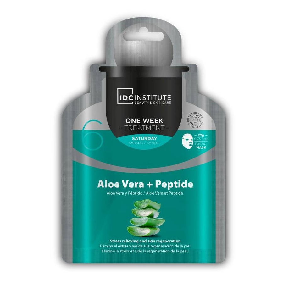 IDC One Week Treatment Saturday jednorázová plátýnková pleťová maska (Aloe Vera + Peptide/Relieves Stressed Skin and Boosts Cell Regeneration) s výtažky Aloe vera a peptidy. Pleťová maska od IDC Institute je vyrobena z tenkého plátýnka přizpůsobeného tvaru obličeje a je napuštěna pro pokožku blahodárnými složkami, které pronikají do svrchních vrstev pokožky a navracejí pleti zdravý vzhled. Maska díky extraktům z aloe vera obsahuje fytoestrogeny, navíc maska obsahuje vitaminu B1 a B2. Osvěžuje unavenou pleť. Výtažek z Aloe Vera obsažený v masce zvláčňuje a osvěžuje pleť. Intenzivně hydratuje a uzdravuje podrážděnou pokožku. Obsažené peptidy regenerují, rozjasňují, zlepšují pružnost pokožky, snižují viditelnost prvních vrásek. Další rostlinné výtažky pomohou oživit a zklidnit podrážděnou pleť od vnějších vlivů.