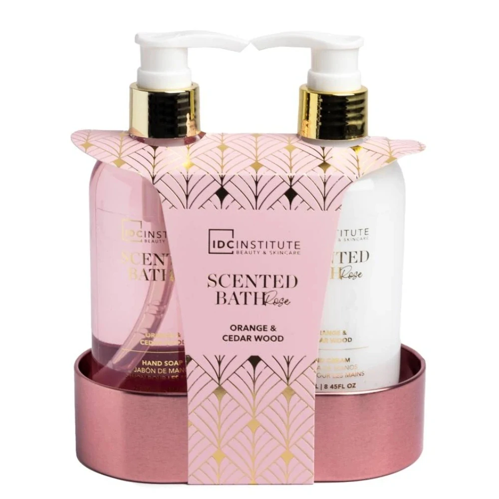 Elegantní dárková sada IDC Institute Scented Bath Rose v sobě spojuje dvě základní péče o pokožku – tekuté mýdlo a krém na ruce, obě s okouzlující vůní pomeranče a cedrového dřeva. Tekuté mýdlo o objemu 250 ml jemně čistí a osvěžuje pokožku, zatímco krém na ruce ve stejném objemu poskytuje hydrataci a ochranu suchým a namáhaným rukám. Díky elegantnímu balení je tato sada ideálním dárkem pro každou příležitost nebo jako součást každodenní péče o tělo. Aromatická kombinace svěžího pomeranče a hřejivého cedrového dřeva vás zanechá zklidněné a regenerované.