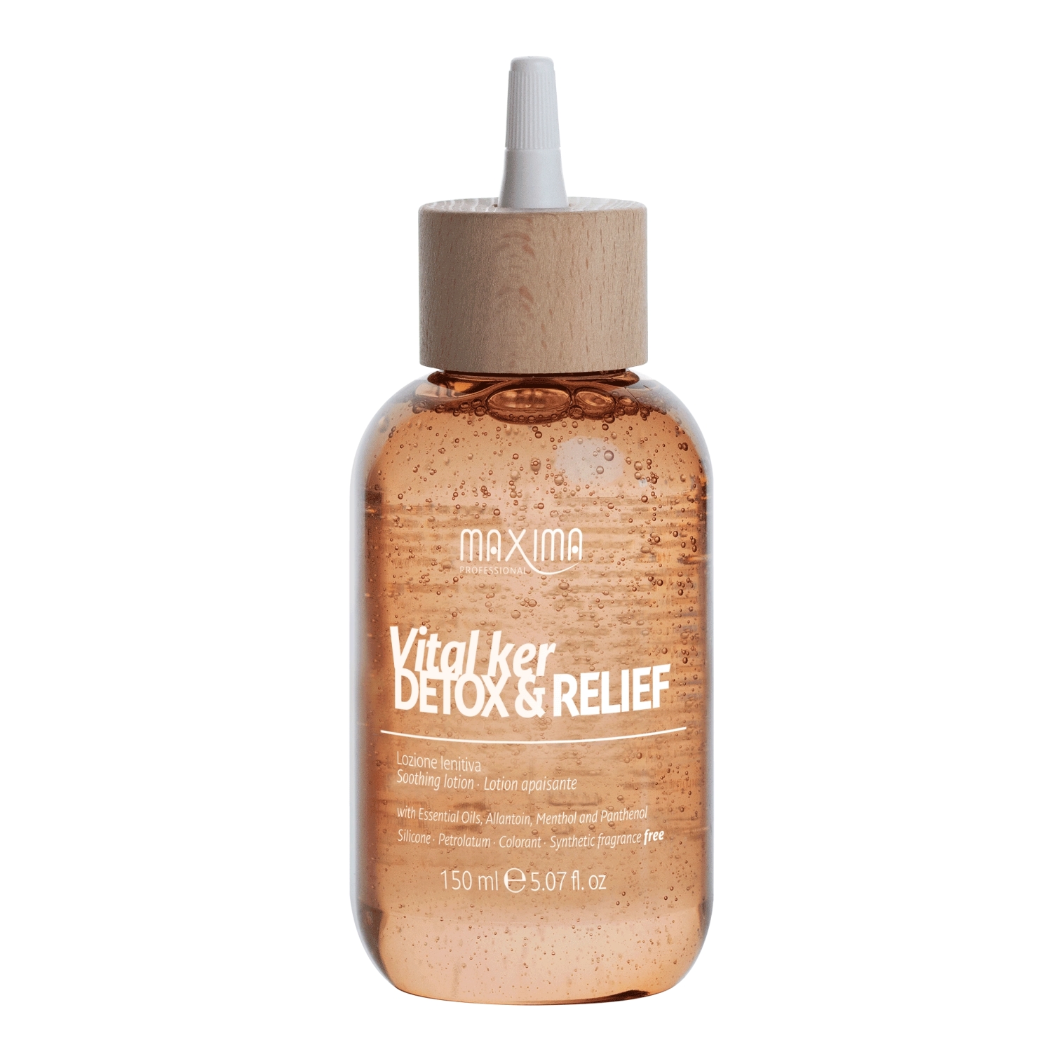 Řada VITAL KER DETOX & RELIEF je speciálně navržena pro potřeby citlivé, podrážděné nebo chemicky zatížené pokožky hlavy. Produkty této řady přinášejí okamžitou úlevu od nepříjemných projevů, jako je svědění, pálení, napětí nebo zarudnutí, které často vznikají v důsledku barvení, trvalé, narovnávání nebo jiných agresivních zákroků. Díky vysoce účinnému složení obohacenému o esenciální oleje, alantoin, panthenol a mentol, napomáhá VITAL KER DETOX & RELIEF zklidnit podrážděnou kůži, podpořit regeneraci a obnovit přirozenou rovnováhu pokožky hlavy. Neobsahuje silikony, ropné deriváty, syntetická barviva ani parfemace, a je tak vhodná i pro velmi citlivou pleť. Ideální jako preventivní péče před chemickými procedurami i jako uklidňující kúra po jejich dokončení.