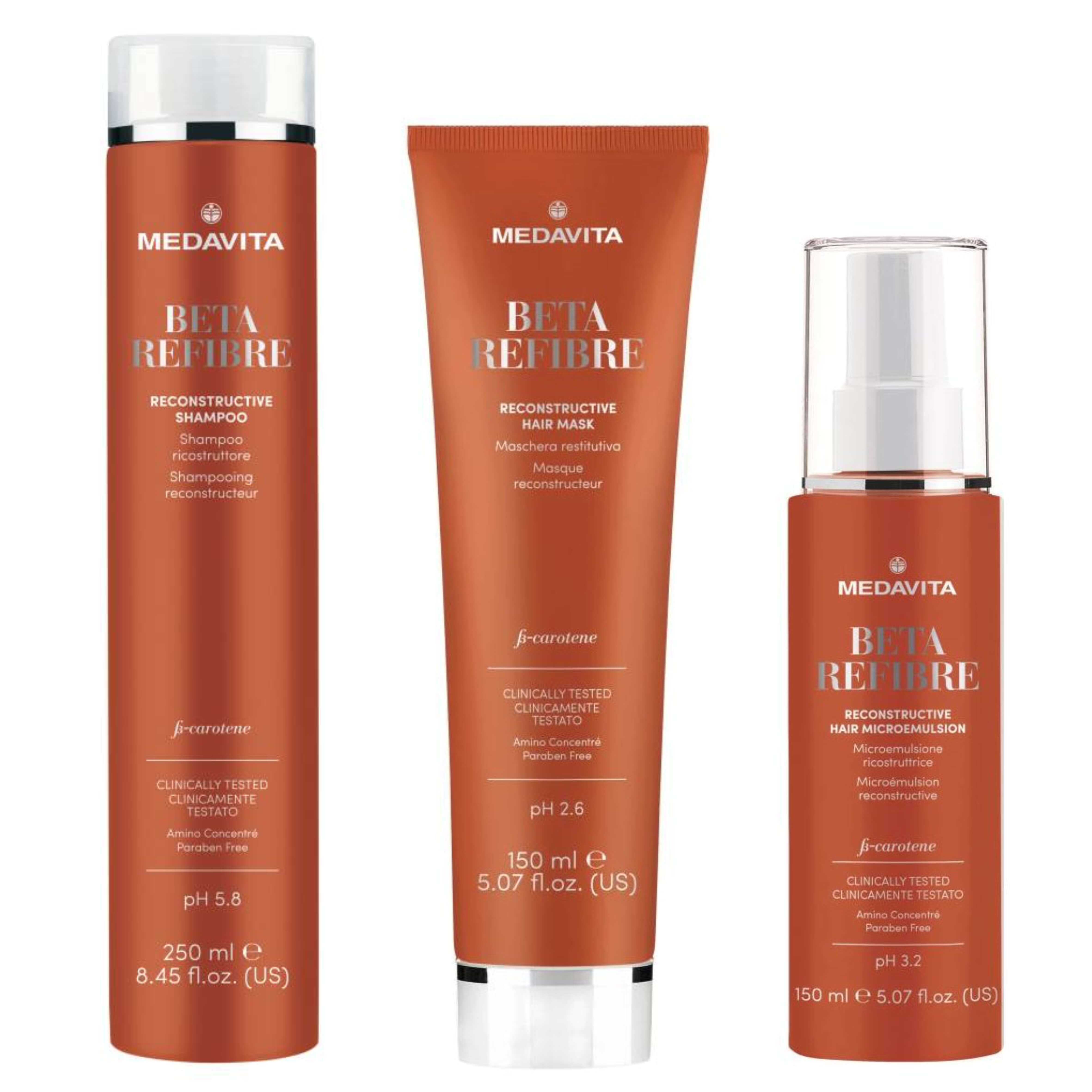 MedaVita Beta Refibre obnovující mikro-emulze na vlasy pH 3,2 (Microemulsione Ricostruttrice pH 3,2) je mikro-emulze ve formě vlasového spreje pro hloubkovou obnovu vlasového vlákna. Obsahuje Beta-karoten, dává okamžitý efekt posílení, lesku, rozjasnění, hebkosti a krásy. Vlasy jsou regenerované, hydratované a plné energie. Obohacený o cenný komplex Amino Concentrée prodlužující výsledek obnoveného vlasu.