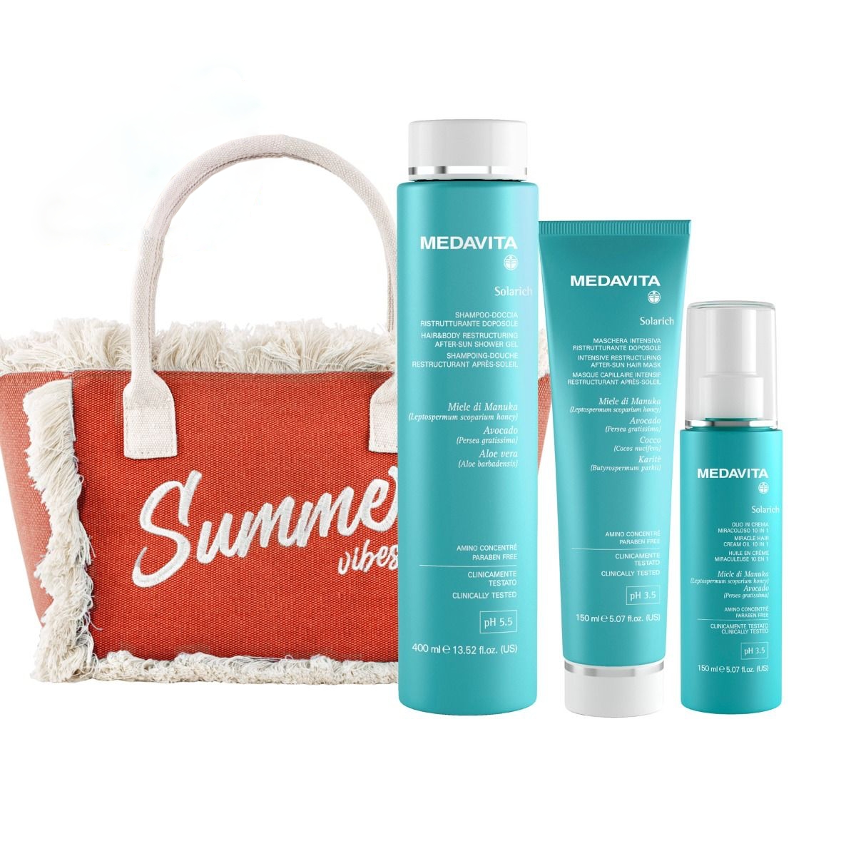 Objevte dokonalou letní péči o vlasy s exkluzivním setem Medavita Solarich, který spojuje ochranu, regeneraci a výživu do jediné sady. Kosmetická sada obsahuje tři klíčové produkty navržené pro každodenní péči o vlasy během slunečných dnů – šampon 2v1 pro vlasy i tělo, intenzivní regenerační masku a multifunkční sprej 10v1 s UVA/UVB filtry. Vše je doplněno o stylovou letní taštičku v limitované edici zdarma. Péče Medavita Solarich je obohacena o pečlivě vybrané přírodní látky jako manukový med, avokádový olej či aloe vera, které zajišťují hloubkovou hydrataci, obnovu a ochranu vlasové struktury. Sada Medavita Solarich poskytuje komplexní péči před, během i po pobytu na slunci, chrání barvu i strukturu vlasů, předchází vysoušení, krepatění a třepení konečků. Díky lehkým a příjemným texturám je ideální pro každodenní použití, nezatěžuje a zanechává vlasy lesklé, jemné a zdravé.