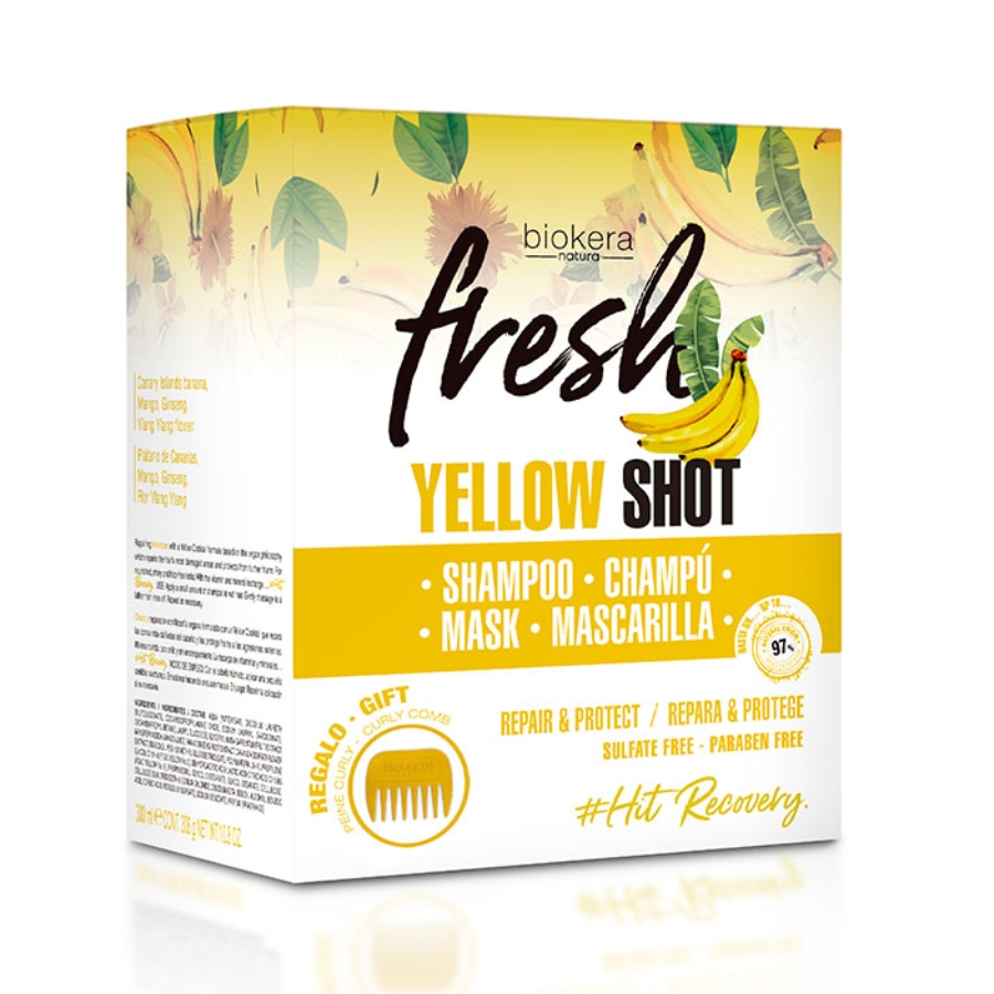 Kosmetická sada Biokera Fresh Yellow Shot (Repair & Protect/Sulfate Free/Paraben Free) je 100% veganské ošetření poškozených vlasů s více než 90 % přírodních složek. Udělejte radost sobě nebo svým blízkým perfektním kosmetickým setem Biokera Freh Yellow Shot od Salerm Cosmetics. Péče dodá vlnitým a kadeřavým vlasům potřebné vitamíny a minerály s vůní banánů. Řada pro regeneraci a ochranu je schopná obnovit vlasy poškozené vnějšími agresemi. Péče dodá vlasům potřebné vitamíny a minerály s vůní banánů. Hlavní ingredience tohoto žlutého koktejlu jsou kanárské banány, mango, ženšen, habešský olej, mandlový olej a květ ylang ylang. Balíček plný vlasové péče jako dárek vždycky potěší. K nákupu šampónu a masky pro poškozené vlasy Biokera Fresh Yellow Shot získáte nyní jako dárek hřeben určený pro vlnité a kadeřavé vlasy. Limitovaná nabídka (pouze do vyprodání zásob).